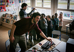 Un objectif : introduire les techniques du sampling auprès des enfants vivants non loin du concert de Beat Matazz prévu le lendemain. Une classe de l’École Jules Ferry découvrira comment créer en un temps record la bande son d’un court-métrage d’animation en faisant les bruitages des personnages et en créant les ambiances sonores.