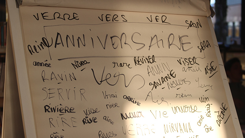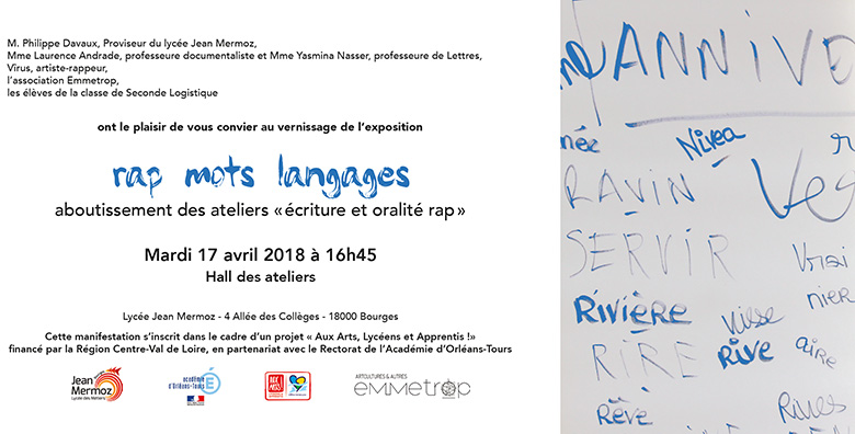 Le vernissage donnera de la visibilité à ces ateliers menés entre novembre 2017 et avril 2018 au sein du Lycée Jean Mermoz par le maître des mots, artiste-rappeur, Vîrus. Au programme : proverbes, charades, définitions et réappropriation de notre langage ; travail typographique mené lors d’un atelier à Mille-Univers ; et surtout, restitution graphique de ces mots remotivés, de ces émotions et ce vécu sensible du langage.