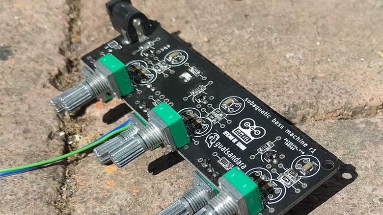 La “Subaquatic bass machine” est un instrument de son électronique qui génère trois ondes sinusoïdales qui oscillent à des fréquences de 39Hz à 150Hz. En mélangeant les ondes légèrement hors phase, des battements peuvent être générés et ceux-ci peuvent être utilisés pour faire une base rythmique d’ondes “pures”.